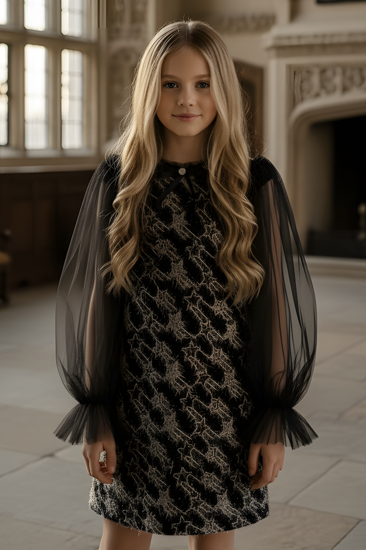 Girls Sonata Black Tweed Dress with Tulle Long Sleeves