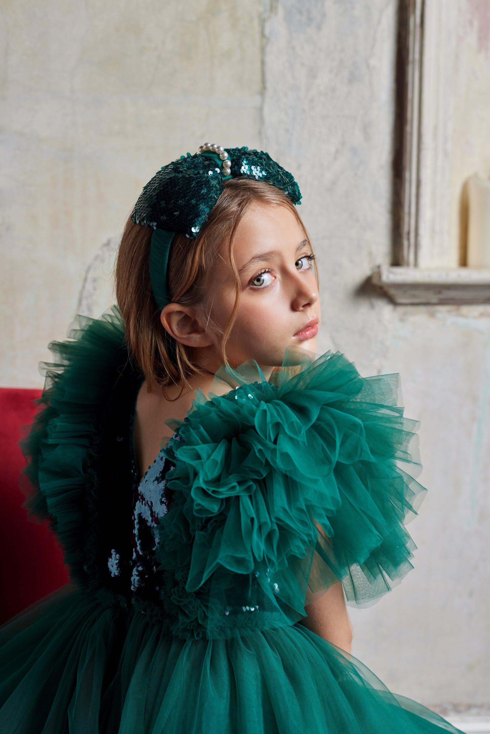 A stunning accessory featuring dark green sequins that shimmer like precious emeralds. The centerpiece is a big bow adorned with lustrous faux pearls, adding a touch of elegance to any hairstyle. Perfect for special occasions or everyday wear, for kids by MissyX.